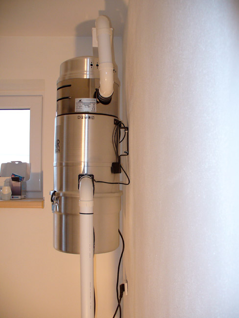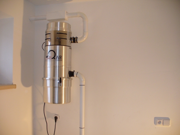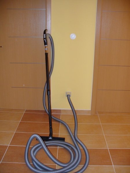 Celokovový agregát centrálního vysavače HUSKY,typ q air cyklon,nerezová podlahová štěrbina a vysavačová zásuvka s příslušenstvím.