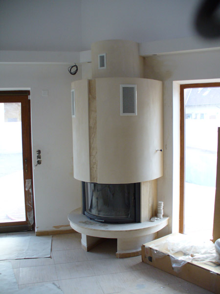 Stavba teplovzdušného krbu v Pardubicích s obestavěním z calciosilikátovích desek. Krbová vložka BEF.