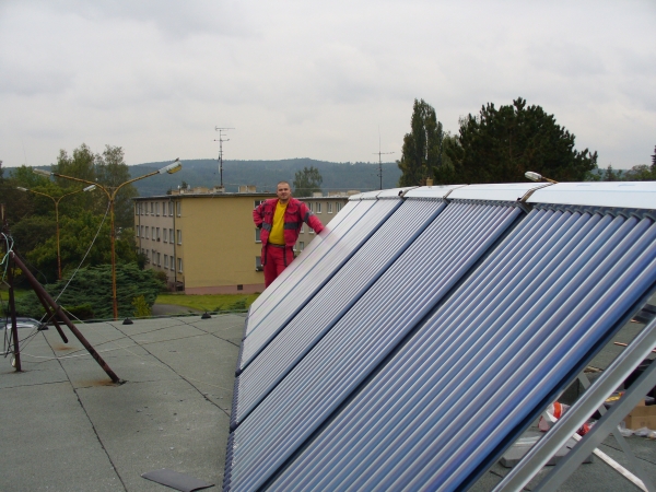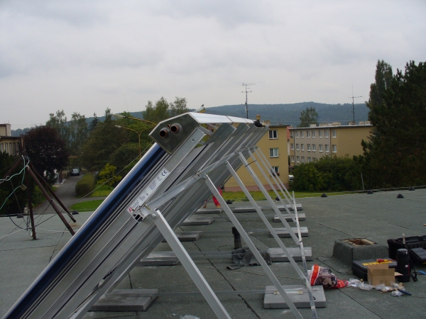 Montáž solárních vakuových trubic na rovnou střechu. Systém je určen na ohřev TUV. U těchto trubic je vysoká sinost.