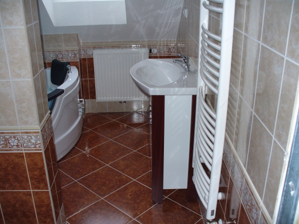 Instalacevody a topení v půdní vestavbě, montáž hydromasážní vany. Byly použity radiátory firmy KORADO, vana od firmy SANPLAST.